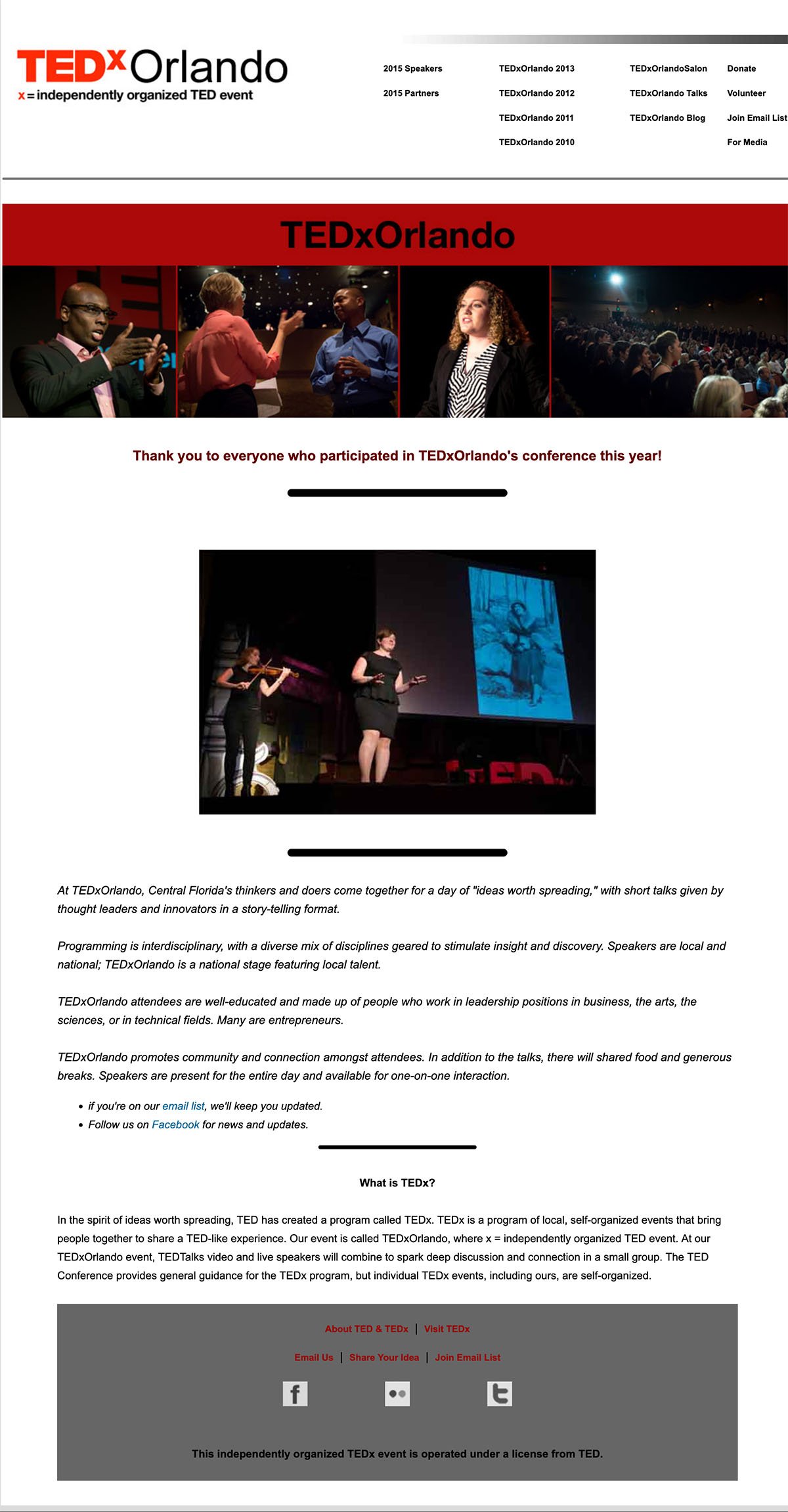 Wordpress site with custom coding for TEDxOrlando (2010-2015).